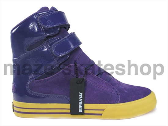O Supra TK Society traz mais uma vem em seu cabedal a camurça roza, mas dessa vez é combinado com o patent leather (couro envernizado) na parte do calcanhar e velcro. O Destaque fica por conta do solado vulcanizado na cor amarela: