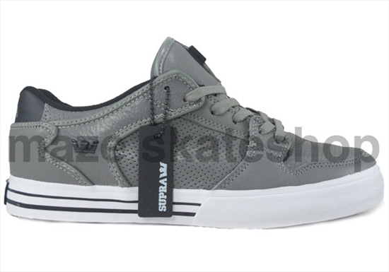 Essa coleção da Supra Footwear traz o couro chamado 'full-grain' em vários de seus tênis. Esse tipo de couro tem como principal característica sua textura e maior durabilidade e é também chamado de 'couro bruto' por não passar por diversas fases de tratamento. Aqui o couro full-grain aparece no Supra Vaider Low, todo na cor cinza: