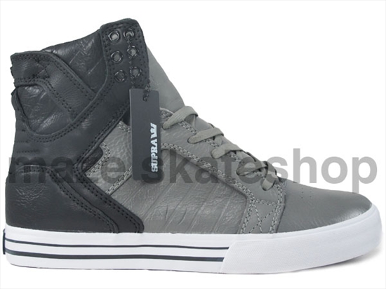 O Supra Skytop também traz o couro 'fullgrain' nas cores cinza e preto. Básico, todo em couro premium e cadarço extra encerado na cor preta: