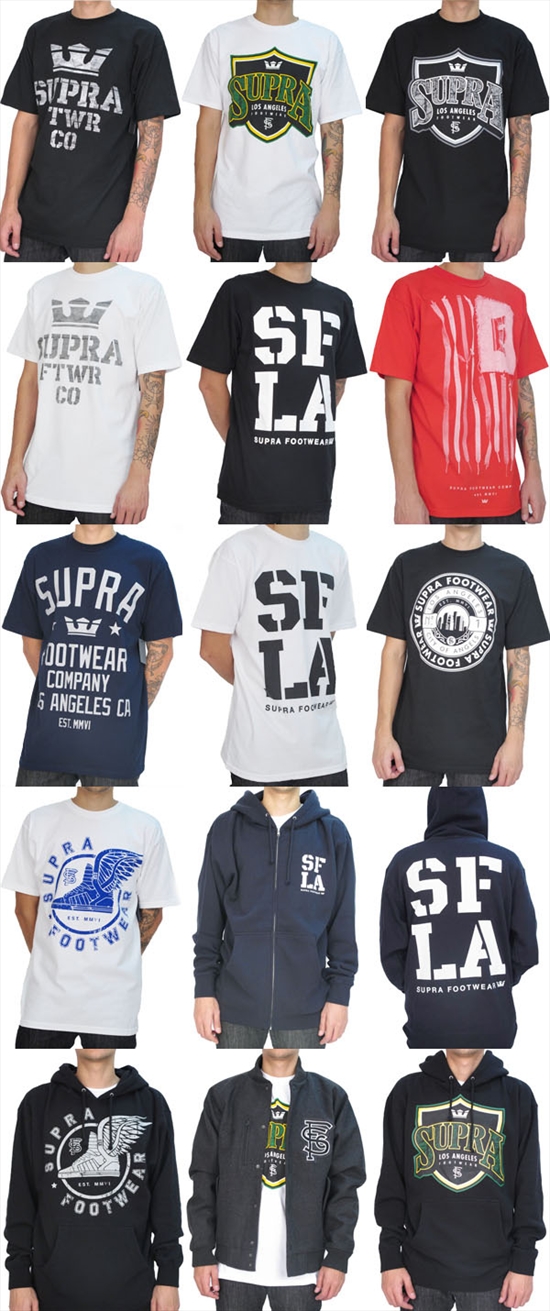 Supra Footwear além de tênis traz também camisetas, moletons, jaquetas e bonés. São 8 novas estampas de camisetas, dois moletons canguru e um com zíper além de uma nova jaqueta estilo 'college' em lã com forro em cetim. Os bonés, todos com ajuste (um deles Starter) trazem novos bordados o padrão 'splatter paint' chega também em dois bonés 'five-panel'. A coleção já está disponível nas lojas Maze Skateshop da Rua Augusta, Shopping Internacional de Guarulhos e loja online:
