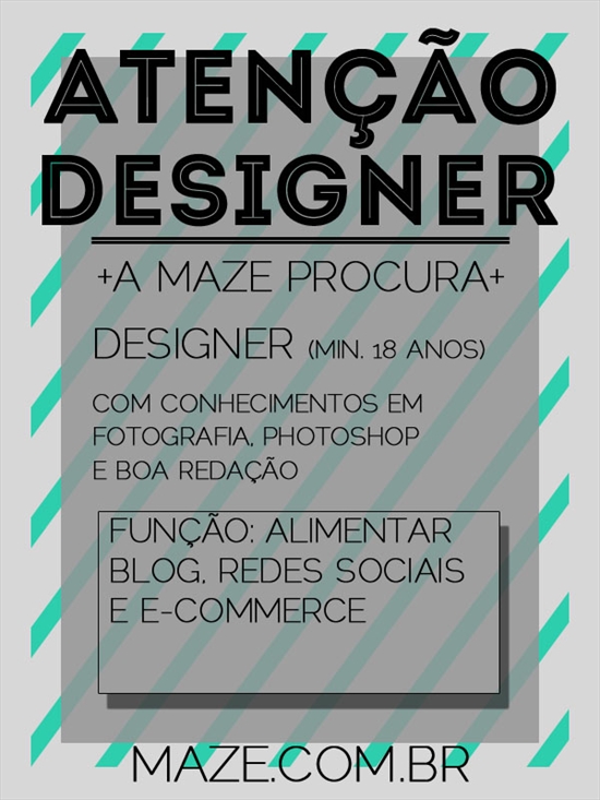 A sua hora de trabalhar na Maze chegou! A Maze procura designer com no mínimo 18 anos de idade com bons conhecimentos em Photoshop, fotografia e que tenha uma boa redação para blog e redes sociais! Sua função será alimentar nosso blog, redes sociais e e-commerce com artes gráficas, fotografias e redação.