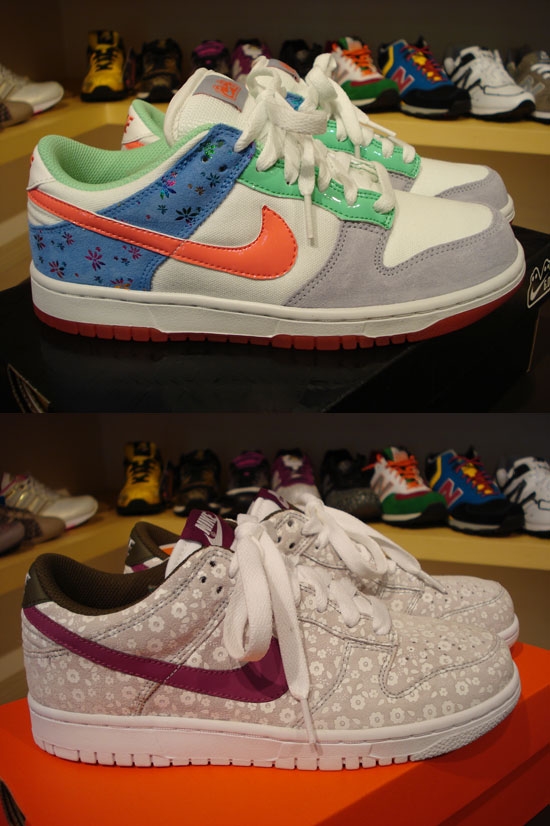 o primeiro, em lona, camurça e com detalhes em patent leather verde, esse Dunk traz detalhes florais fruta-cor na parte do calcanhar e também leva um cadarço extra rosa, na cor do swoosh.