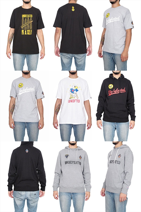 Confira a nova linha de confecção da Undefeated já disponível em todas as lojas Maze! São cinco peças produzidas em tecido 100% algodão nas cores branco, cinza e preto, com estampas variadas: três camisetas com corte Regular Fit e dois moletons fechados, com destaque para o cinza