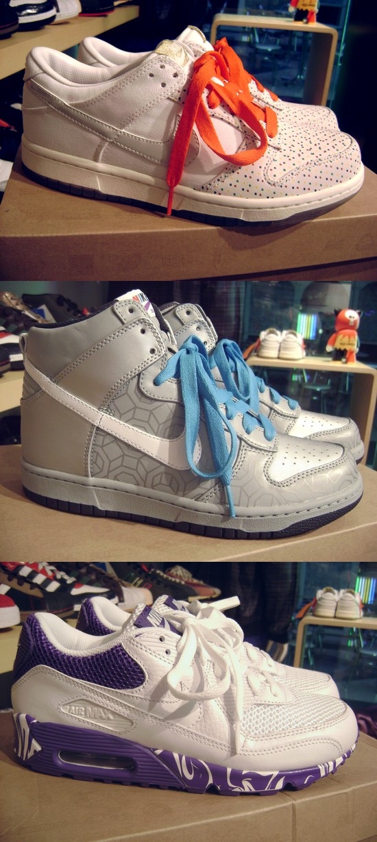 Nike Dunk Hi Premium Octagon: em couro cinza e tecido prateado, encontramos nesse Dunk HI o motivo de Octagonos na cor cinza escuro qe se espalha por todo painel lateral e parte do cabedal. Também com "Zoom AIR", esse modelo traz o swoosh em couro branco e cadarço na cor azul.