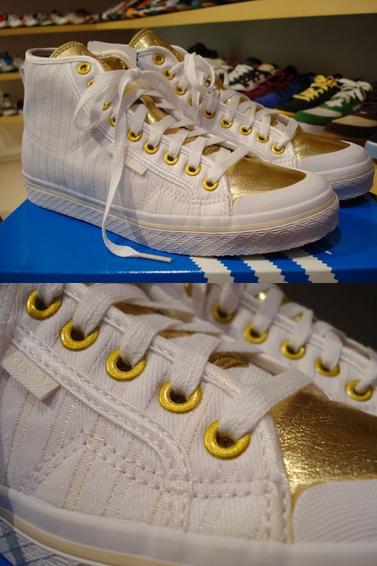 O Adidas Honey Mid é um modelo que traz a silhueta do modelo "Trefoil", famoso na década de 80. Nessa versão, que acaba de chegar a Maze Limited, ele aparece todo em canvas branca com pequenas linhas prata e douradas formando listras, que se repetem por toda a estrutura. O detalhe fica por conta do dourado que esá presente no cabedal e lingua, em couro, nos ilhoses e no forro interno! Poucos Pares!