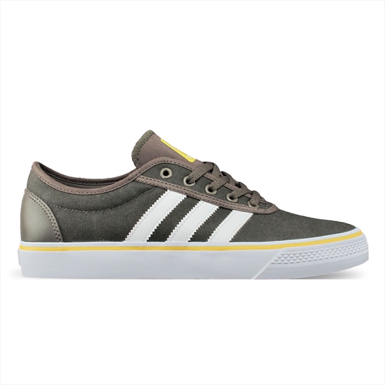 Adi-Ease traz a sua silhueta baixa tradicional com cabedal em mescla de canvas na cor marrom com acentos em couro no calcanhar e no detalhe lateral junto às três listras, que vêm em na cor branca, com linha fina da entressola em amarelo e tag da lingueta. Com ilhóses metálicos e cadarços de algodão também na cor marrom, o modelo traz um solado vulcanizado que aumenta a sensibilidade dos pés em contato com o skate, garantindo grip e desempenho superiores.