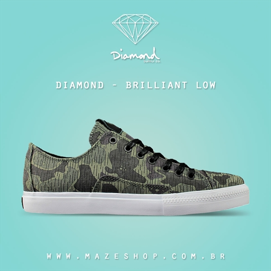 Nova coleção de tênis Diamond Supply Co! Mais um modelo exclusivo aparece nas prateleiras de todas as lojas Maze! Desta vez é o modelo Brilliant Low, um sneaker perfeito para quem quer um calçado clean tanto para andar de skate quanto para dar um rolê. O cabedal do calçado é confeccionado em canvas, tem acabamento impecável, possui tag em couro na língua com o amado logo da Diamond, sem contar com a estilosa estampa "Rain Camo" que torna o sneaker ainda mais bonito. O solado do tênis é vulcanizado e a famosa palmilha hiper confortável! Corra para pegar o seu, quantidades limitadas em todas as lojas físicas e online!