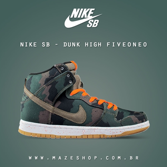 Versão exclusiva do Dunk High SB em uma collab entre Nike SB e FIVEONEO. Com cabedal em canvas na colorway camuflada, o modelo da 510 Skateshop traz Swoosh marrom e cadarços laranja. Com uma opção extra de cadarços na cor preta, a silhueta clássica traz ainda pingos de tinta em laranja na entressola de borracha.