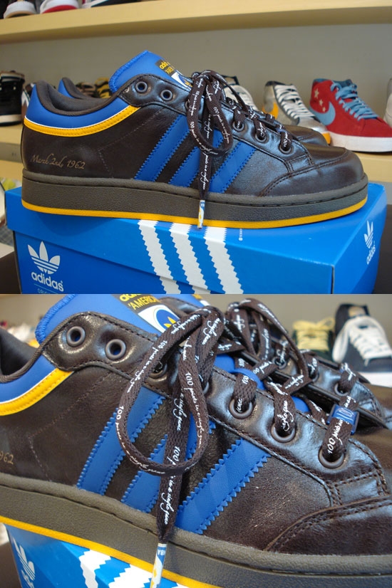 O Adidas Americana Low NBA "Warriors" apresenta a combinação de cores do Philadelphia Warriors: todo em couro marrom (e mesh na mesma cor no revetimento interno), azul (nas três listas, língua e calcanhar) e amarelo ( calcanhar e solado na mesma cor), o tênis possui o detalhe gravado a lazer na lateral "March 2nd, 1962", o cadarço leva a impressão "100 points in a single game" em branco, o "lacepiece" também aparece aqui marcando o número 100 e a pontera exclusiva traz o símbolo da NBA. Na palmilha azul encontramos ainda o símbolo do time.