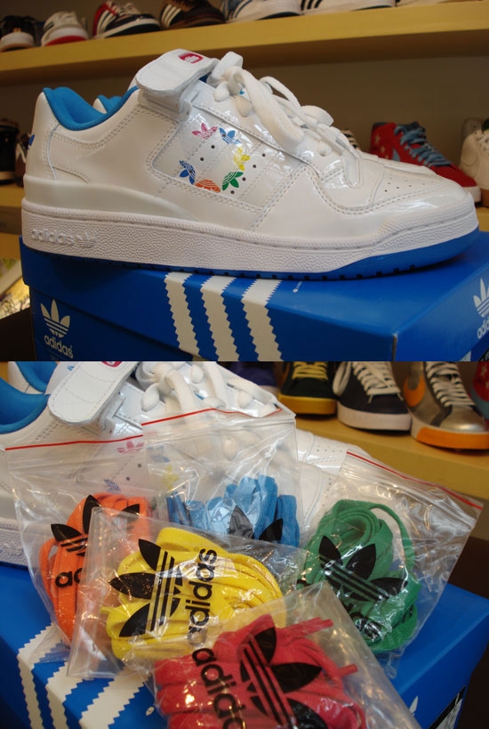 Adidas Forum Lo "Graffiti Collection": todo em vinil branco, encontramos apenas na sola, trevo do calcanhar e revestimento interno a cor azul. O painel lateral traz as "três listras" em vinil transparente, o que destaca os trevos coloridos abaixo das mesmas. As cores ficam por conta dos cadarços extras coloridos: azul, verde, amarelo, laranja e pink, representando as principais cores dos sprays usados para colorir as paredes das ruas do mundo todo.