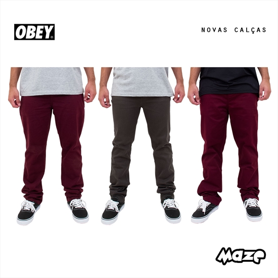 Novas calças Obey. Com opções em jeans e chino, são produzidas em algodão com leve mescla de elastano, o que proporciona à peça maior flexibilidade e conforto, possui fechamento por zíper, traz dois bolsos laterais e dois bolsos traseiros, com discreta tag da marca em patch sobre o bolso direito. Todas contam com a alta qualidade Obey Clothing, confira mais detalhes no link "Comprar" abaixo.