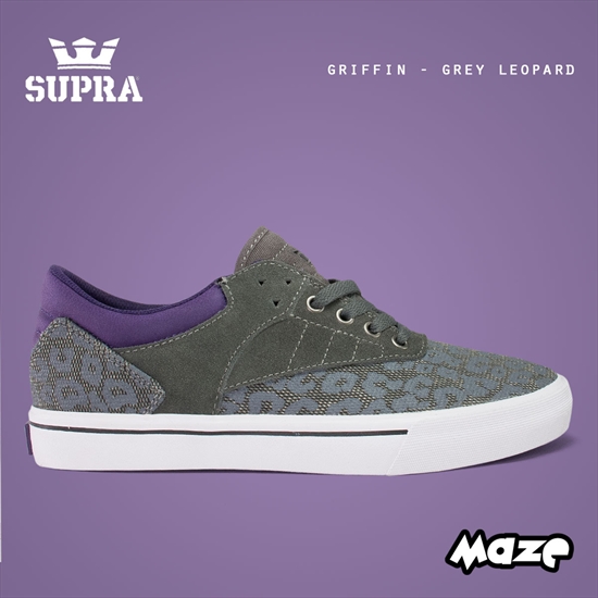 Segundo modelo da Supra é o Griffin, parte da linha Spectre tem design desenvolvido pelo músico e mais novo skatista Lil Wayne, traz cabedal em camurça e lona, cinza com leopard print e detalhes em roxo, muito estilo e super eficaz para quem prefere colocar na lixa. Outro diferencial do modelo é sua entressola extremamente leve com tecnologia SUPRAFOAM ® de resistência a impactos. Extrema proteção incrementada pelo conforto de seu acolchoado interno na área do tornozelo. Conforto, resistência e muito estilo para o seu rolê. Imperdível!