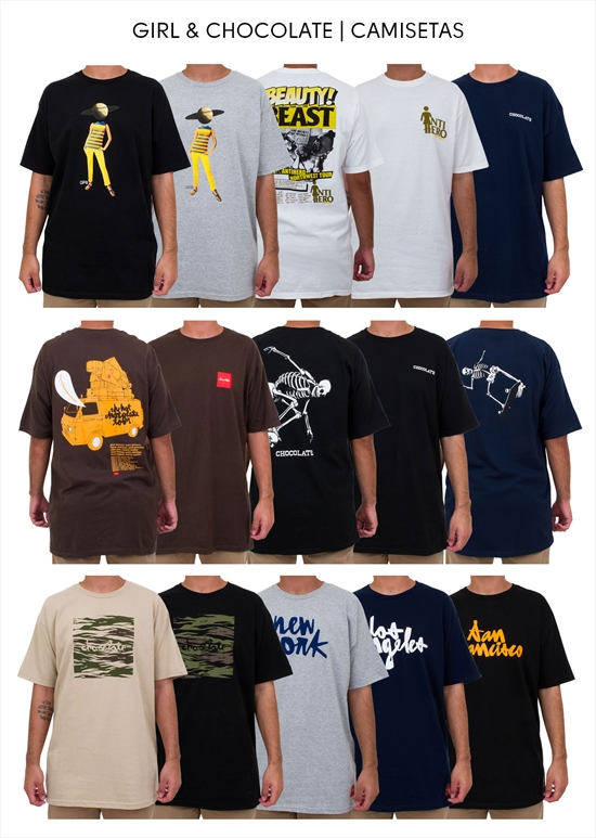 Nova coleção de camisetas Girl & Chocolate, são incríveis e estilosos modelos contanto com a "Spice Girl" da Girl que traz estampa de uma garota com rosto de "planeta", Crailtap Video Tour que traz as camisetas dos clássicos videos feito pela marca como o Hot Chocolate e Beauty & The Beast entre outras. Corra e garanta já a sua!