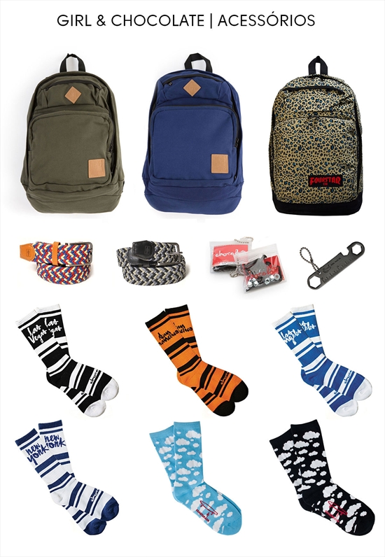 Finalizando a coleção Girl & Chocolate, temos os incríveis acessórios da marca, variando entre mochilas, cintos, chaveiros, parafuso e meias, que são ótimas opções para dar um estilo mais diferenciado na hora do role. Confira!