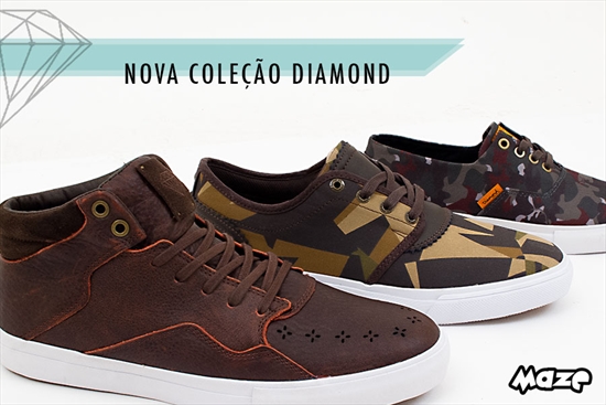 E acaba de chegar a nova coleção Diamond Footwear! São três estilosissimos modelos que não podem ficar fora da sua coleção. O primeiro modelo é o Folk Mid, que traz cabedal inteiro em couro de alta qualidade, solado vulcanizado e etiquetas em couro bordado na lingua do calçado. Já o segundo modelo é o Premiere, que traz cabedal em canvas com detalhes em couro; possui estampa "Brilliant" que remete ao brilho de um diamante, clássica estampa que a marca sempre usa em suas peças. Finalizando a coleção temos o Cuts que traz cabedal em canvas com estampa camuflada e solado vulcanizado, que garante mais aderencia entre os pés e o skate. Corra e garanta já o seu!