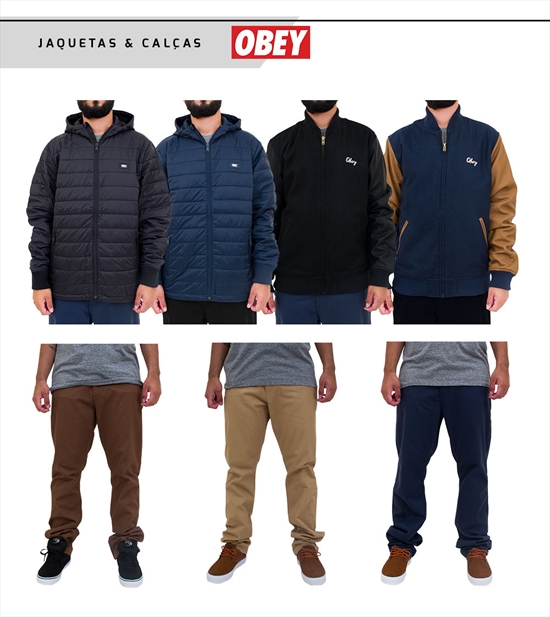 Finalizando a linha de confecção Obey, o que não podia ficar de fora são as lindas jaquetas e as famosas calças chino, que vieram em três cores diferentes, variando entre corte regular fit e slim fit. Garanta já!