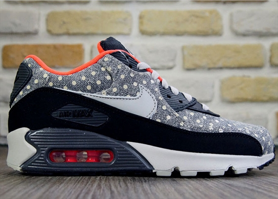 Edição "Premium" do clássico Nike Air Max 90, mescla o couro jeans na cor azul com detalhes em "Polka Dot" e nobuck premium na cor preta.