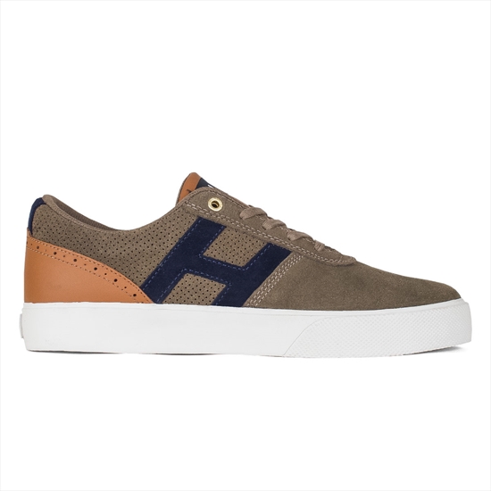 suede premium e couro. O calçado possui um "H" azul marinho em suede costurado na lateral, c