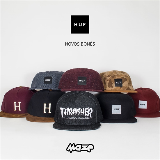 Mais novidades HUF disponível! São os famosos bonés exclusivos da marca com modelos de 5 panel, strapback e snapback. A Maze recebeu os mais variados modelos com estampas e tecidos especiais como por exemplo o de lã e o incrível plantlife refletivo! Um dos maiores destaques da coleção é o snapback parte da collab entre HUF x Thrasher que chega em denim! Garanta mais um para sua coleção!