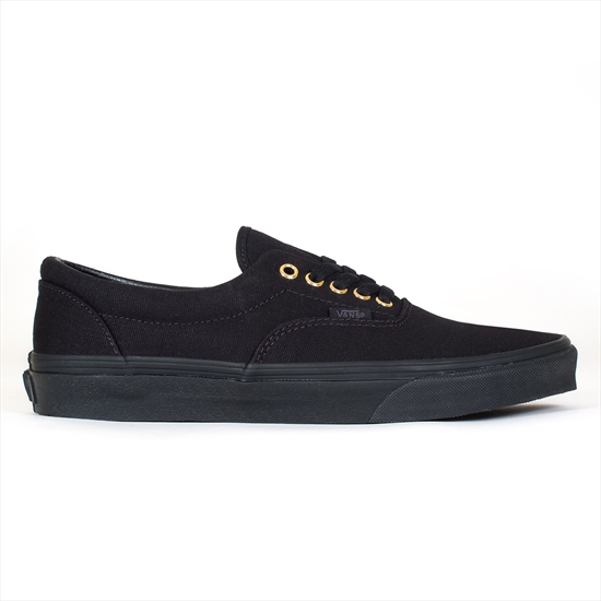 vans Era chega em edição Mono Gold! Nessa versão monocromática o cabedal em canvas, as costuras, cadarços e até o solado vulcanizado aparecem em preto. O destaque são os ilhóses em dourado, que dão um charme nesse sneaker cheio de classe! Um must-have pra quem curte sneakers e um visual clássico.