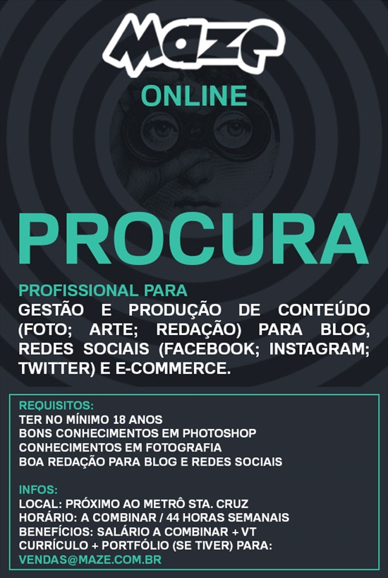 A Maze procura profissional com no mínimo 18 anos de idade, bons conhecimentos em Photoshop, fotografia e que tenha uma boa redação para blog e redes sociais! Sua função será alimentar nosso blog, redes sociais e e-commerce com layouts, fotografias e redação.