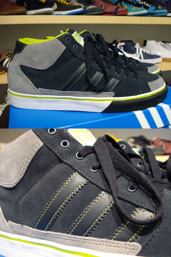 Adidas Superskate dessa vez vem todo em camurça, material muito usado devido a sua durabilidade e maior adesão à lixa do skate. As cores preta e cinza contrastam com o verde limão que aparece na sola, na listra do solado vulcanizado, nas costuras das "três listras" (em couro sintético preto), no forro também em couro sintético e no trevo no calcanhar.