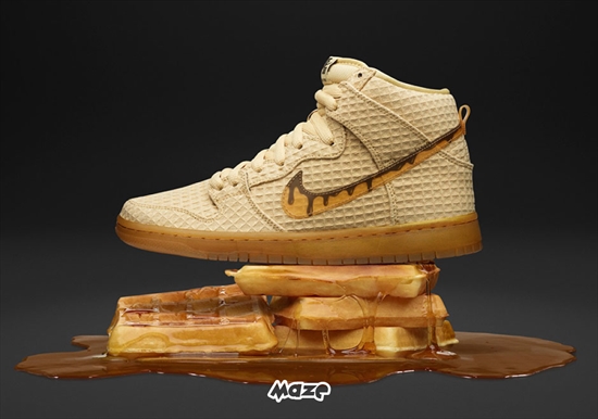 Nike sb Dunk Hi "Chiken And Wafles" traz cabedal de tecido texturizado, remetendo ao padrão waffle, que é uma refeição tradicional Americana, com Swoosh e solado translúcido fazem referência à manteiga derretida e à calda de maple, além de trazer ilustrações na palmilhas que complementam a refeição.