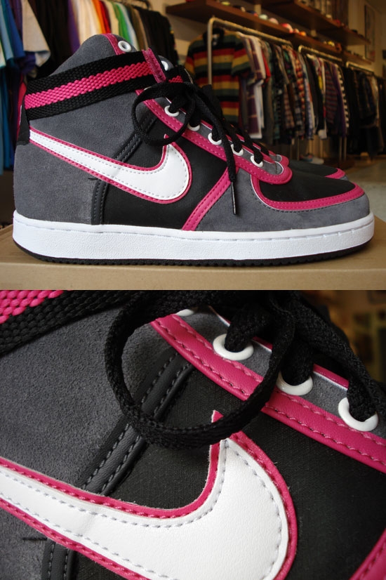 Nike Vandal Hi traz o toebox e painel lateral emborrachado com grafismos e cabedal em camurça cinza chumbo. O couro liso aparece no swoosh branco (cor também dos ilhóses e midsole) e nos acabamentos das costuras nas cores cinza escuro e pink, cor que se destaca no tênis. Língua em nylon preto e velcro removível.