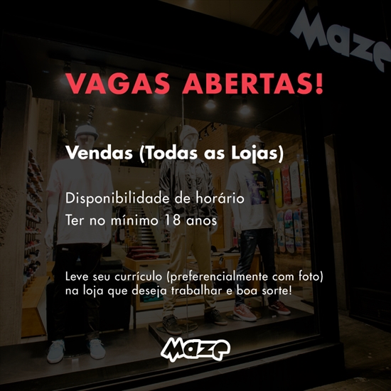 Se você tem no mínimo 18 anos de idade, bons conhecimentos dos produtos e universo da Maze e muita energia, venha fazer parte de nossa equipe!