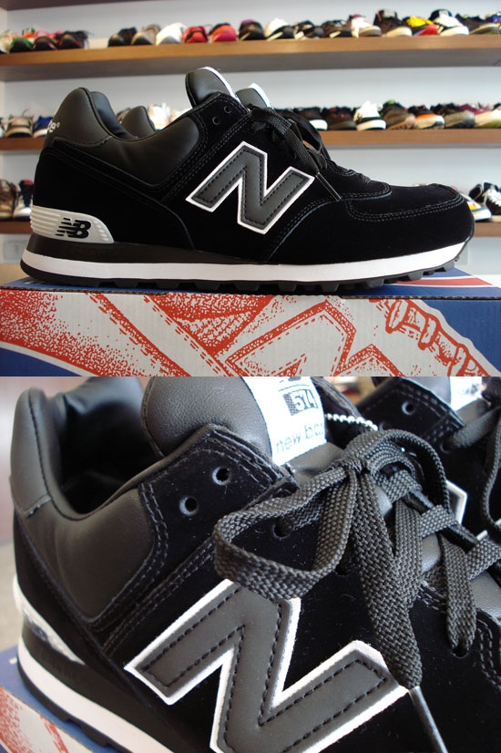New Balance M574 N1 chega todo em nobuck premium preto e combina o couro liso na mesma cor no calcanhar, língua e no acamento impecável do forro.