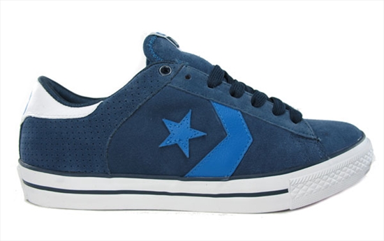 CONS Pro Leather 'Navy' traz detalhes em couro azul royal no painel lateral e em branco no calcanhar:
