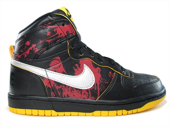 A colorway traz couro sintético preto com detalhes em amarelo, swoosh em prateado (nos lembrando a espada usada por Black Mamba) e é claro, como não podia faltar sangue, lood splatter no painel lateral.