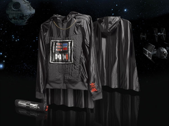 Darth Vader a la Adidas Originals. A jaqueta conta ainda uma capa e o painel frontal removível por pequenos botões pretos e um estojo com zíper para você guardar a sua jaqueta que imita um sabre de luz.