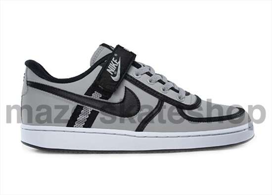 Nike Vandal Low todo em nobuck cinza claro com detalhes em couro preto em volta das costuras. O preto também aparece no forro e velcro:
